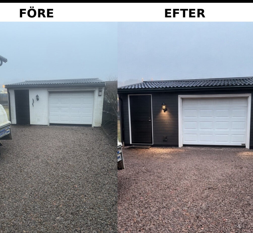 Här renoverade vi ett garage genom att montera ny träpanel och därefter måla fasaden i en modern mörk kulör. Resultatet blev ett stilrent och hållbart garage som lyfter hela fastigheten.
